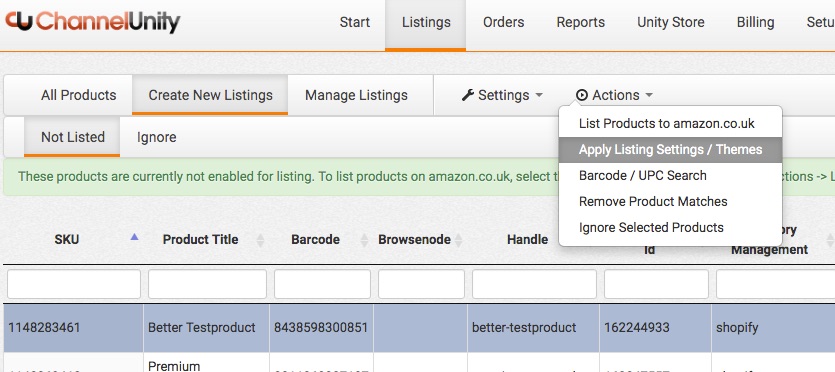 You can only apply listing settings to products that aren’t currently in the Uploading tab. To do this, highlight the desired items, go to Actions > Apply Listing Settings / Themes and select the one you want from the drop-down.