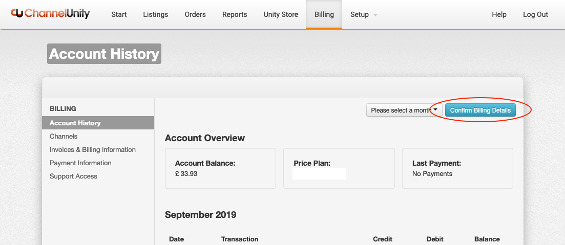 We are implementing a new billing system, and require ChannelUnity merchants to confirm their billing address and re-input their card details. To do this, follow the steps below.
