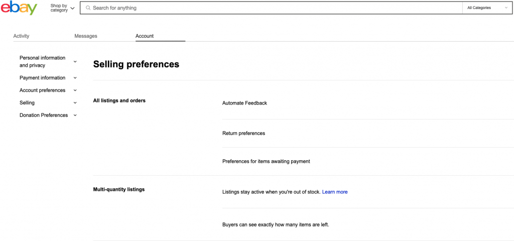 To enable out of stock options in eBay you need to find your Selling Preferences page in eBay Seller Hub.