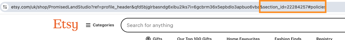 To find your Etsy Shop Section ID Policies, simply head to the Browse By Section area on your shop and click into one section.