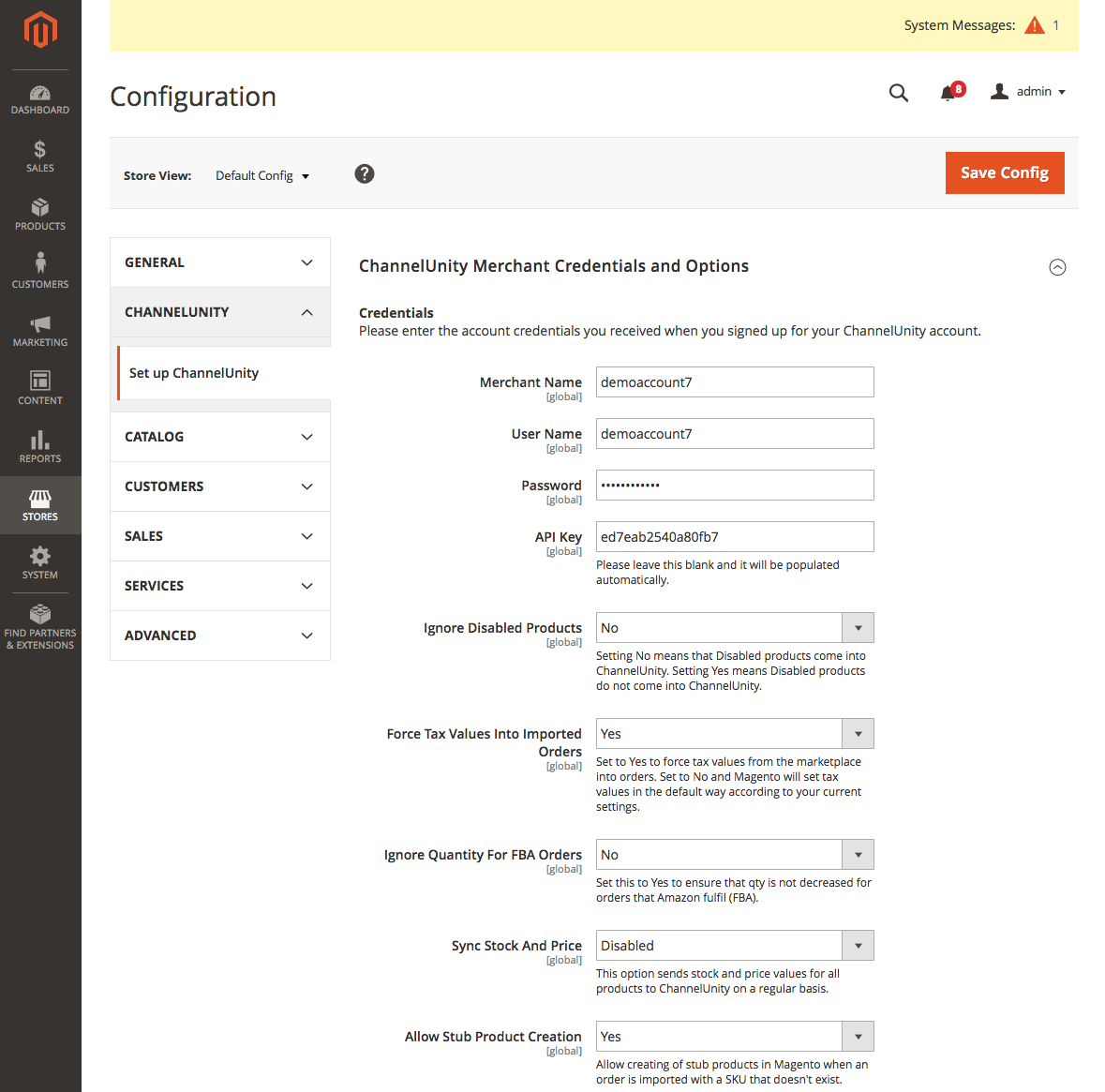 To view the settings, in Magento click on Stores > Configuration. Then click on ChannelUnity > Set up ChannelUnity. You will see a screen that looks like this.