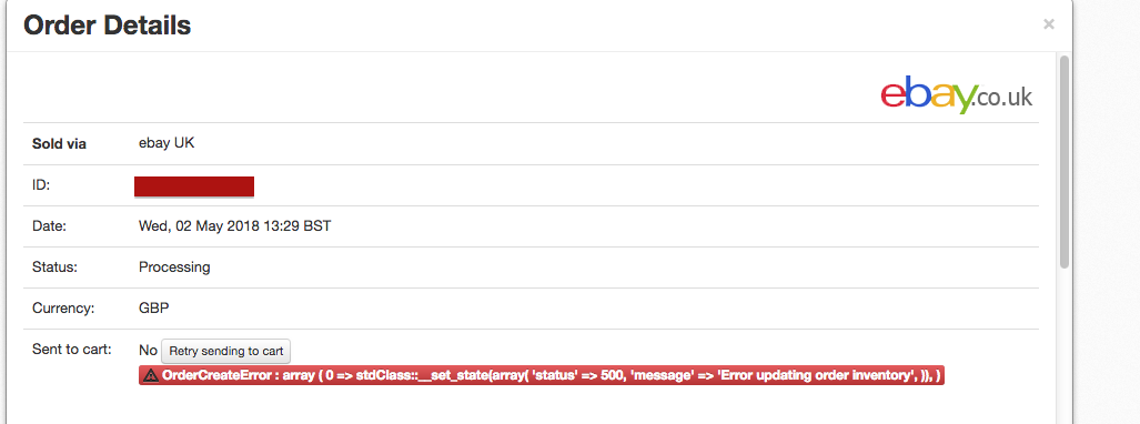 Go back to ChannelUnity, locate the order in the Orders tab, and choose ‘Retry sending to cart’.