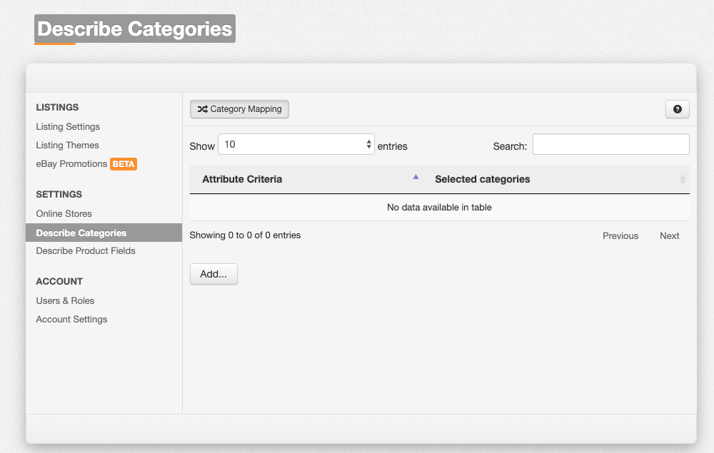 Login to ChannelUnity and navigate to Setup > Describe Categories. The following screen will appear: