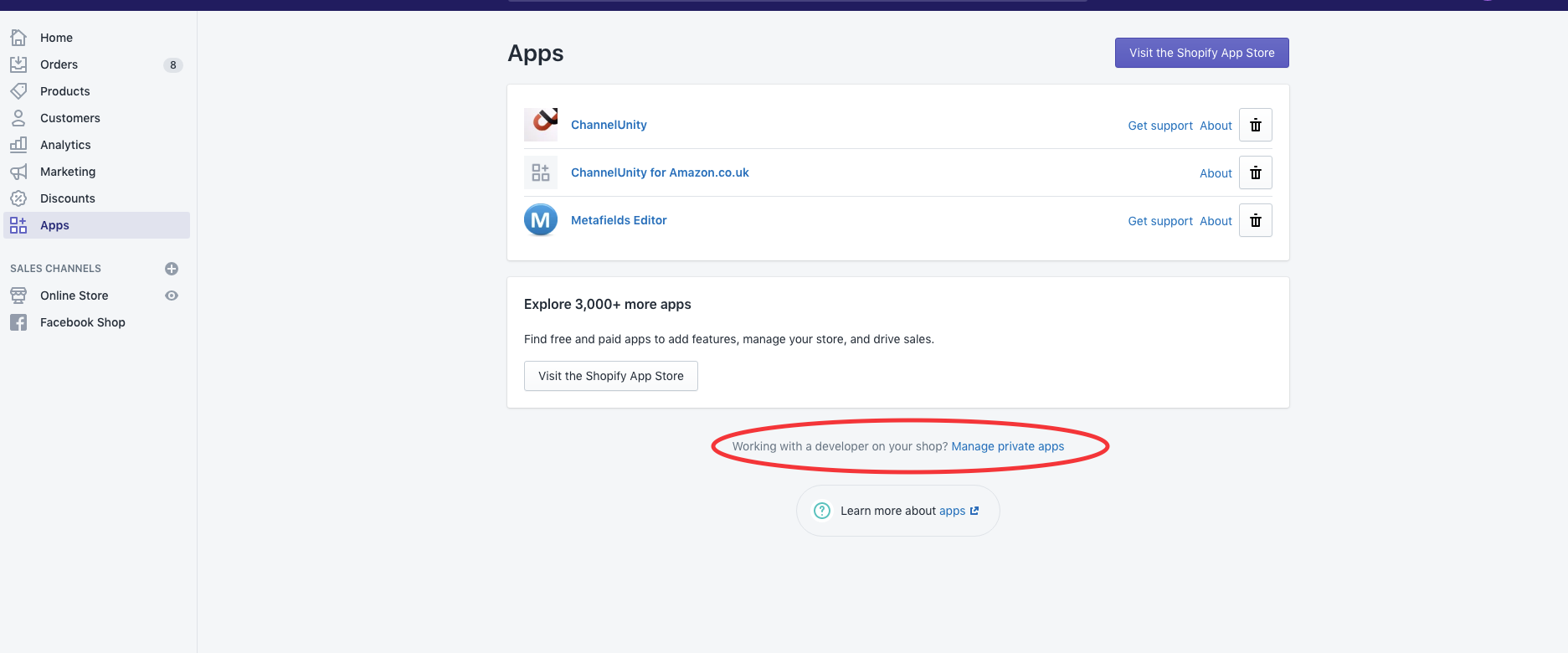 - Create a Private App in Shopify: In the App section is some small print: ‘Working with a developer on your shop? Manage private apps’. Click on this then create private app.