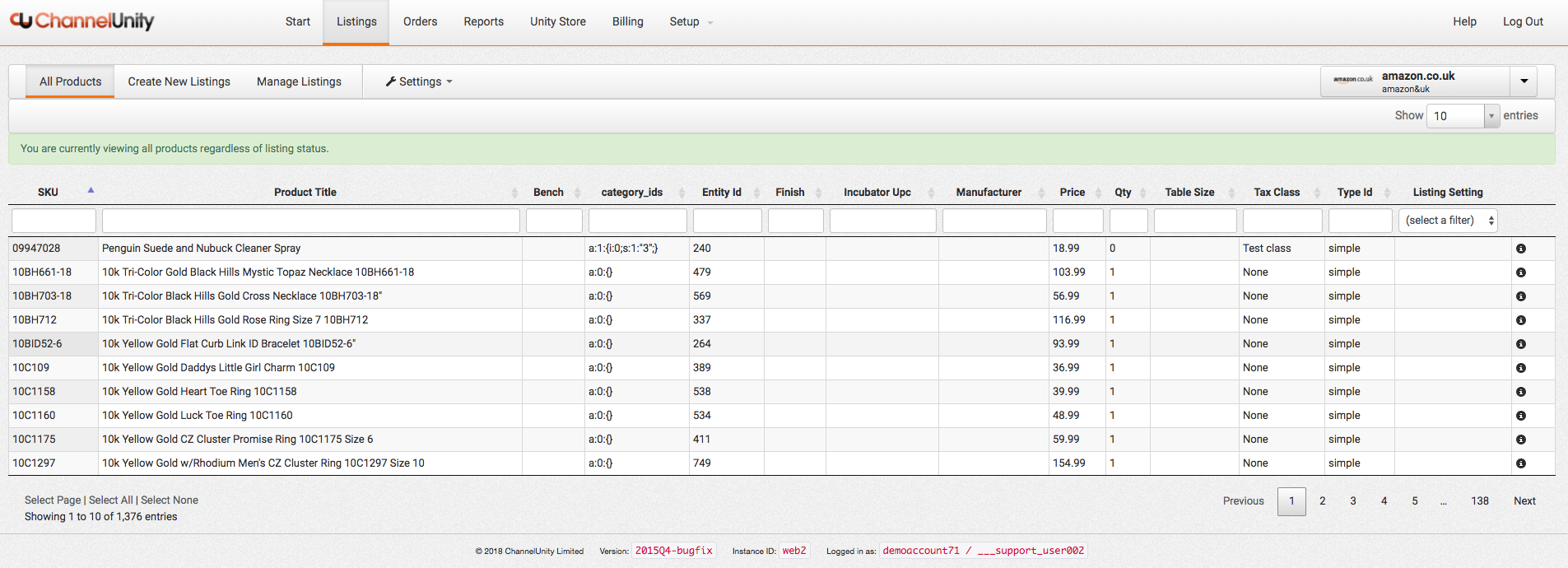 Once you’re ready, start in your ChannelUnity account and click on Listings. You should see a screen like the following: