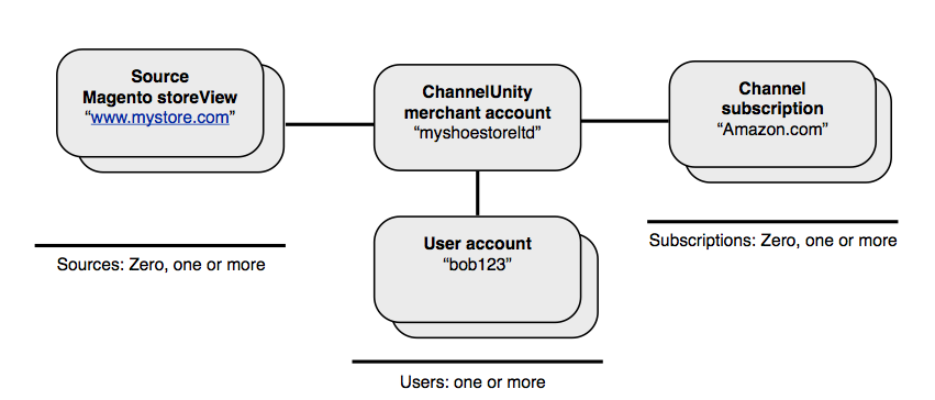 Each merchant also has a set of “sources”. Each source is a shopping cart which can be the main retail website running Magento for example. A source provides product data and category data to ChannelUnity which is used to synchronize with the shopping channels. Each source has a Base URL, and in the case of Magento sources, a store view ID to link to a specific store. The diagram below illustrates this model.